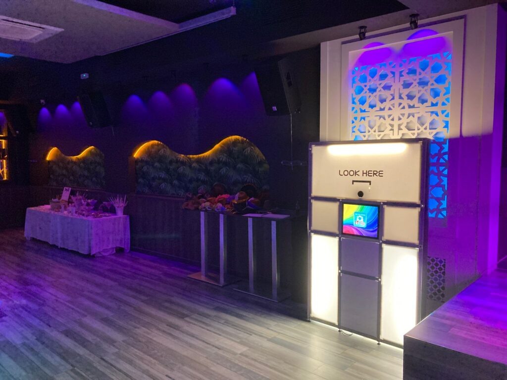 Nuestro Fotobox Abierto se integra perfectamente en cualquier ambiente. Su estructura moderna y su sistema de iluminación LED lo convierten en el punto más fotografiado del evento.